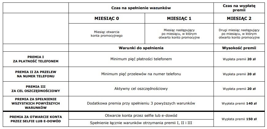 Przykładowo, jeśli konto otworzysz w grudniu, to czas na spełnienie warunków masz przez cały grudzień oraz styczeń. Najpóźniej 31 stycznia na Twoim Celu musisz posiadać 50 zł. Nagrody zostaną Ci wypłacone do 28 lutego.