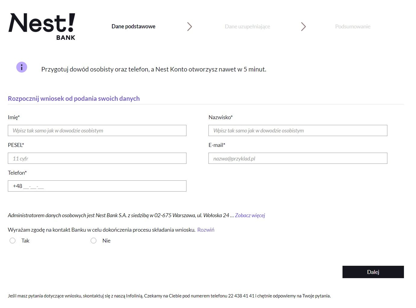 Wejdź na stronę promocji i następnie kliknij przycisk „Załóż Konto”. Następnie uzupełnij wniosek swoimi prawidłowymi danymi. Koniecznie pamiętaj o wyrażeniu zgód marketingowych!