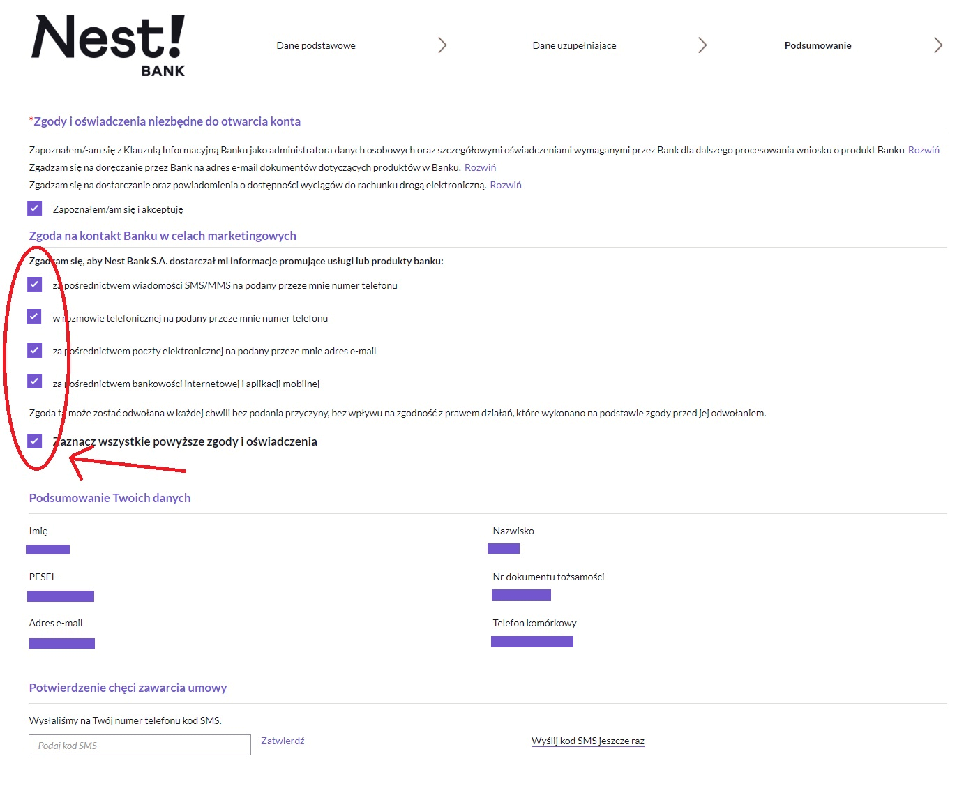 Na końcu sprawdź poprawność swoich danych i potwierdź chęć zawarcia umowy kodem SMS. Również w zależności od wyboru sposobu otwarcia konta będziesz musiał potwierdzić tożsamość.