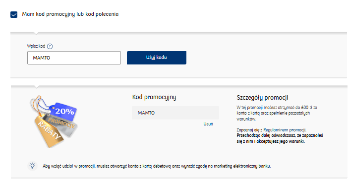 Wejdź na stronę promocji i złóż wniosek o konto w PKO BP wraz z wydawaną do niego kartą Visa oraz zaakceptuj zgodę na pliki cookies. Rozpocznij wypełnianie wniosku klikając Otwórz konto a następnie wybierz rodzaj konta, który chcesz otworzyć. Polecam PKO Konto za Zero, gdyż pozwoli zdobyć Ci cały bonus i jest darmowe. W trakcie wypełnienia wniosku obligatoryjnie wpisz kod promocji: MAMTO oraz wyraź zgody na otrzymywanie od banku informacji o charakterze marketingowym. Jest to wymagane, aby wziąć udział w promocji. Konto możesz otworzyć za pośrednictwem kuriera, bądź metodą na selfie lub za pośrednictwem mObywatela (pod warunkiem, że wniosek uruchomisz na urządzeniu mobilnym).