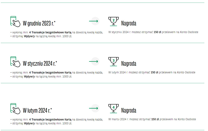 Warunkiem uzyskania każdej kolejnej premii w wysokości 150 zł jest uprzednie (we wcześniejszym miesiącu) spełnienie warunków uzyskania poprzedniej premii 150 zł. A więc przykładowo: by dostać premię 150 zł za styczeń, uprzednio w grudniu musisz mieć zrealizowane warunki uzyskania pierwszej premii 150 zł za grudzień.