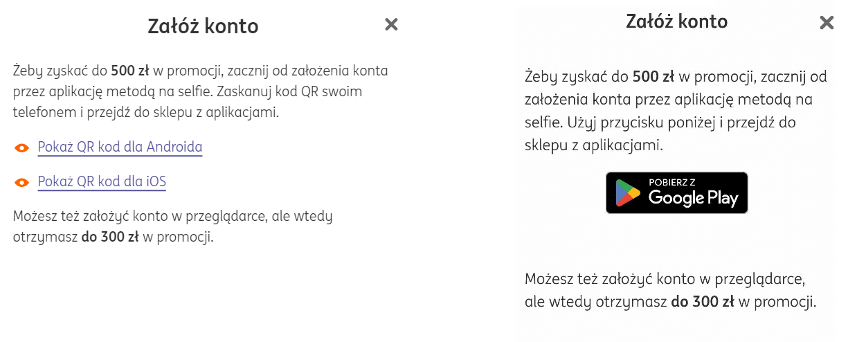 - Konto musisz otworzyć metodą na selfie w aplikacji ING. Najwygodniej będzie, jeśli na stronę promocji przejdziesz bezpośrednio z urządzenia mobilnego, wtedy od razu zostaniesz przekierowany do pobrania aplikacji. Nie pomijaj kroku z przejściem na stronę promocji, gdyż wtedy możesz nie zostać podpięty do promocji. Na stronę możesz także wejść przez komputer, wtedy do pobrania aplikacji przekieruje Cię specjalnie wygenerowany kod QR.
