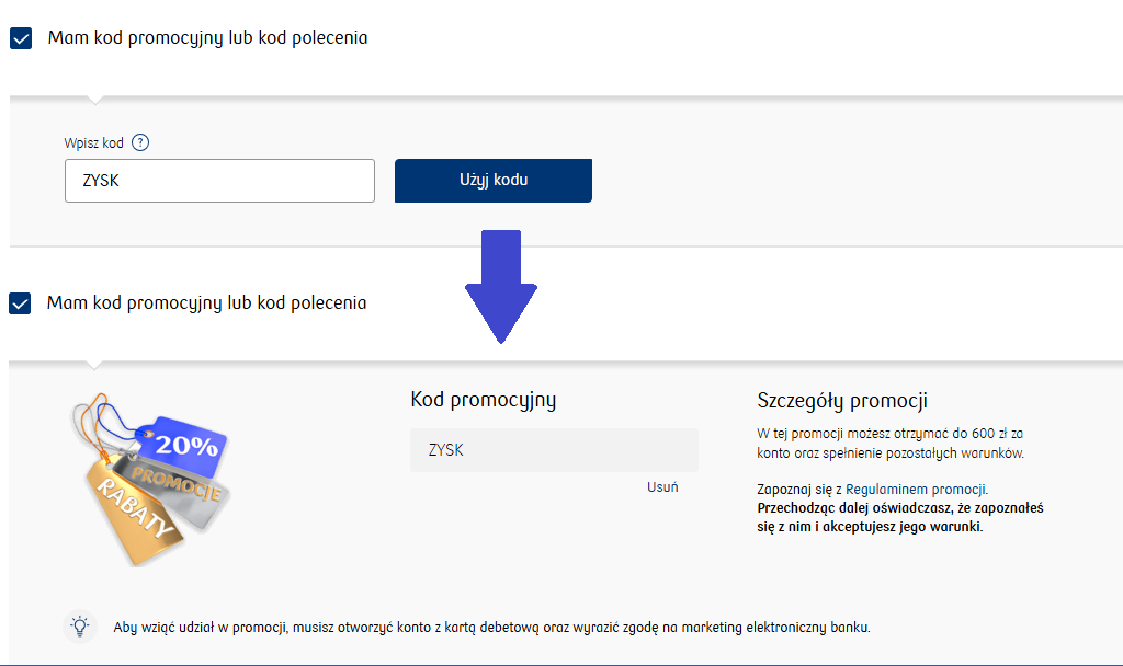 1️⃣ Otwórz konto w PKO BP wraz z kartą wpisując odpowiedni kod promocji oraz wyraź zgody